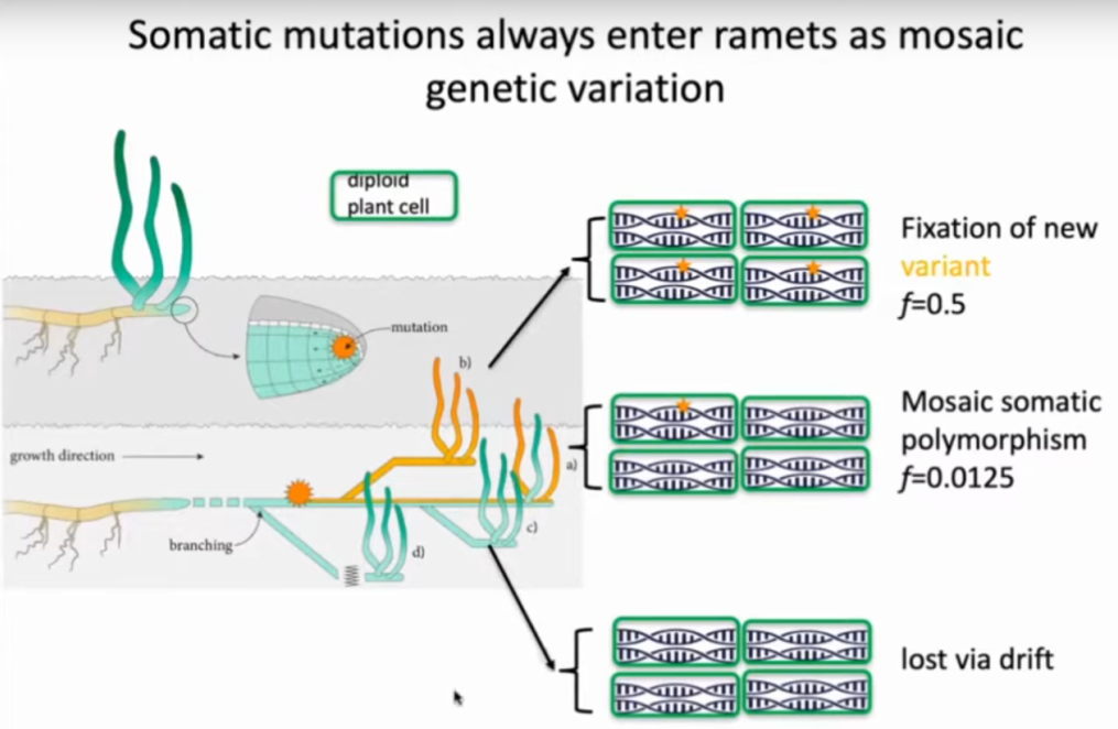 Du fait du développement en arborescence, les mutations qui aboutissent à des variants (les mutations qui se fixent) vont concerner des branches particulières (de l’arbre, ou de l’herbier dans le cas des zostères)