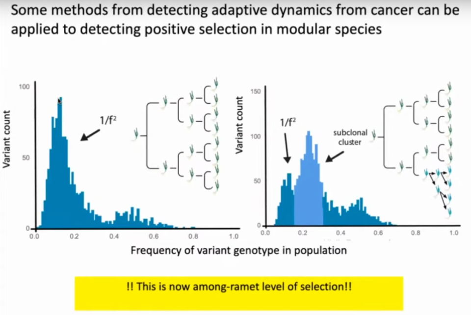 Également, la propagation d’un variant dans une plante est proche de ce qu’on peut observer à l’intérieur d’un corps, lorsqu’un cancer se développe. Les cellules cancéreuses sont des clones portant une mutation « positive » (au sens où elles se multiplient plus vite que les autres). Un chercheur a pu montrer qu’une telle mutation apparaît comme une bosse dans le diagramme des fréquences. Un programme de recherche commun a été monté.