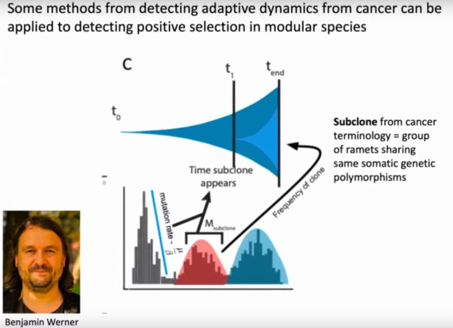 La présentation commence par rappeler que le clonage est le mode de reproduction de 60% des plantes, de la majorité des champignons et même de 40% des animaux. Des clones souvent millénaires, comme certains coraux ou les posidonies, ont colonisé de nombreuses zones, parfois très différentes, alors qu’on a longtemps pensé et enseigné que le clonage était une reproduction à l’identique, sans évolution. Cela a constitué longtemps une énigme pour l’écologie.