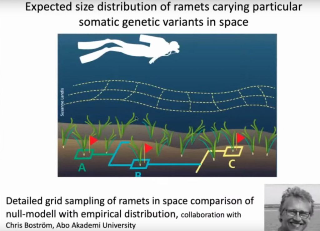 La recherche a démontré qu’à l’intérieur d’un même seul clone (une tache de zostère avec un seul rhizome) le polymorphisme génétique est déjà important. L’expérience ci-dessous a consisté à séquencer 24 morceaux de rhizomes (« ramets ») du transect d’un herbier de zostères. Les 24 génomes montraient des différences substantielles (des SNP), mais très peu fréquentes, au point que le professeur parle de mosaïque. Les différents génomes peuvent être représentés sur un arbre génétique.